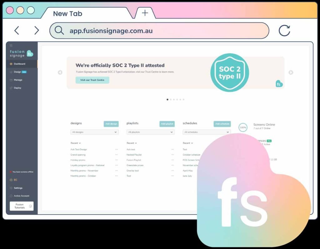 When it comes to digital signage, trust is everything. Fusion Signage just achieved a major security milestone, SOC 2 Type II attestation, critical to all users of digital signage software. Fusion Signage is widely regarded as Australia’s “friendliest” digital signage software, and that’s why it’s running over 19,500 digital signage screens across Australia and New Zealand. This includes 99.99% server uptime for the entire lifespan of Fusion Signage to date.