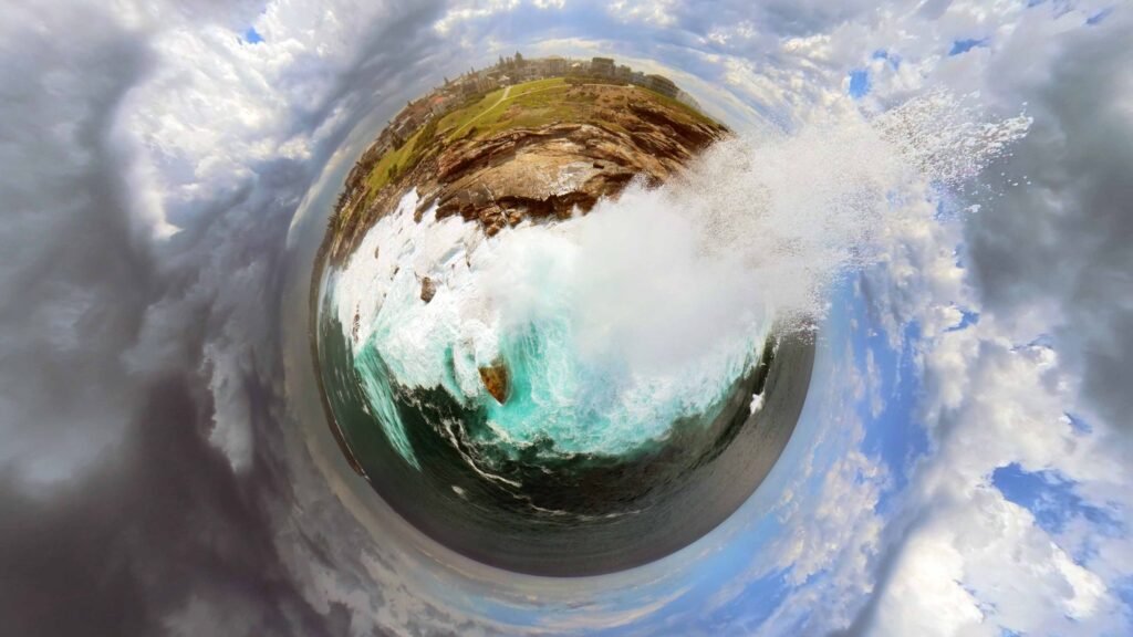 I love tiny planet shots, when you pull right out and the subject takes the form of a small world. I particularly like this one below with the wave rising up and reaching the lens. You can get some insanely distorted images, but it’s easy to overdo it.