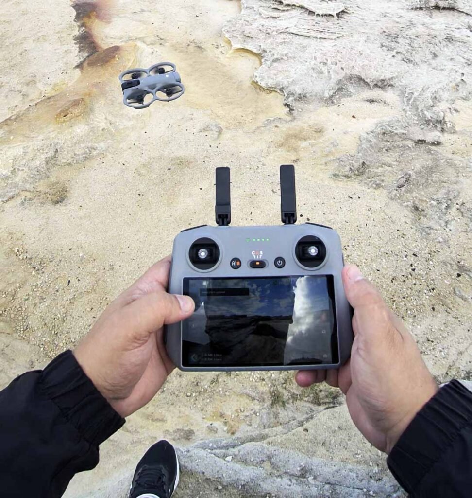 The Avata 360 can fly up to 23 minutes, but this varies depending on wind. It definitely pays to get the Fly More Combo with the extra batteries. It’s also very clever, as it takes off, the cameras rotate into position, facing up and down. When the drone lands, the cameras rotate sideways so the lenses are protected.