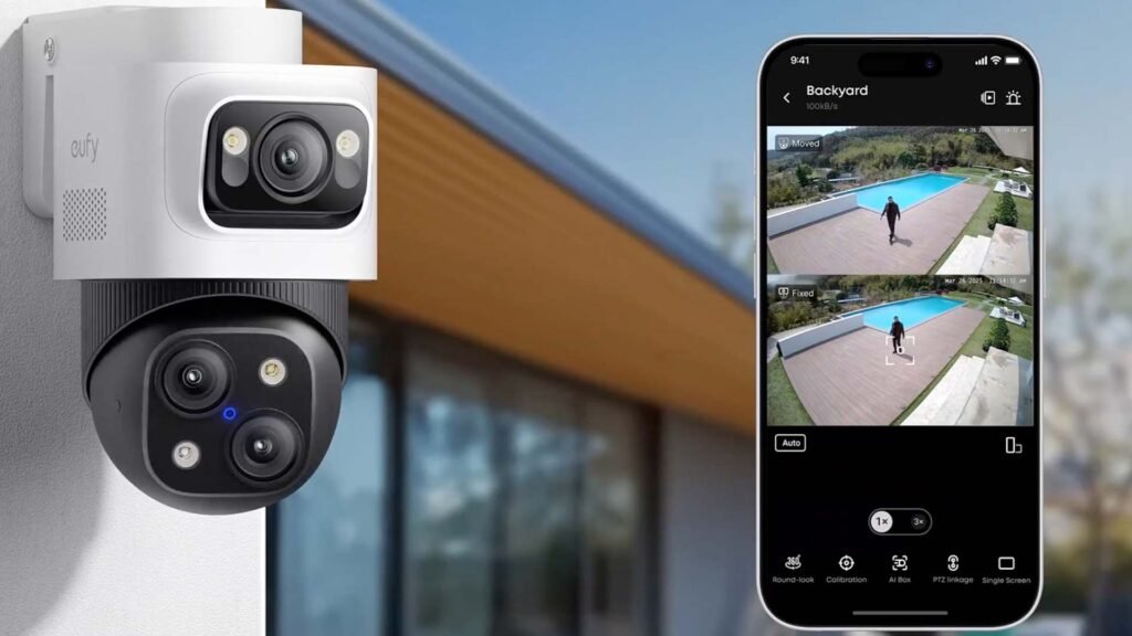 The new S4 Max System and S4 System feature eufy’s new PTZ cameras, which combine a 4K fixed bullet camera with a 2K dual-lens PTZ camera to deliver both wide-angle coverage and close-up detail in a single device. The bullet camera provides a 122∘degree field of view, while the PTZ camera offers 360∘ detailed tracking. When the bullet camera detects a target, the PTZ camera automatically locks on, tracks, and follows the subject. The cameras feature Intelligent Auto-Framing, which automatically zooms in on individuals up to 50 meters away to capture clear details, and zooms out for groups to ensure everyone stays in view. A dual motion detection system, combining radar and passive infrared (PIR) technology, accurately identifies human and vehicle movement while minimizing false alerts. If an intruder approaches, red and blue warning lights activate alongside a 105dB siren, providing a powerful visual and auditory deterrent. The cameras also offer 360∘ pan and tilt flexibility to eliminate blind spots and 8x digital zoom (5x digital +3x optical) with full clarity up to 20 meters away.